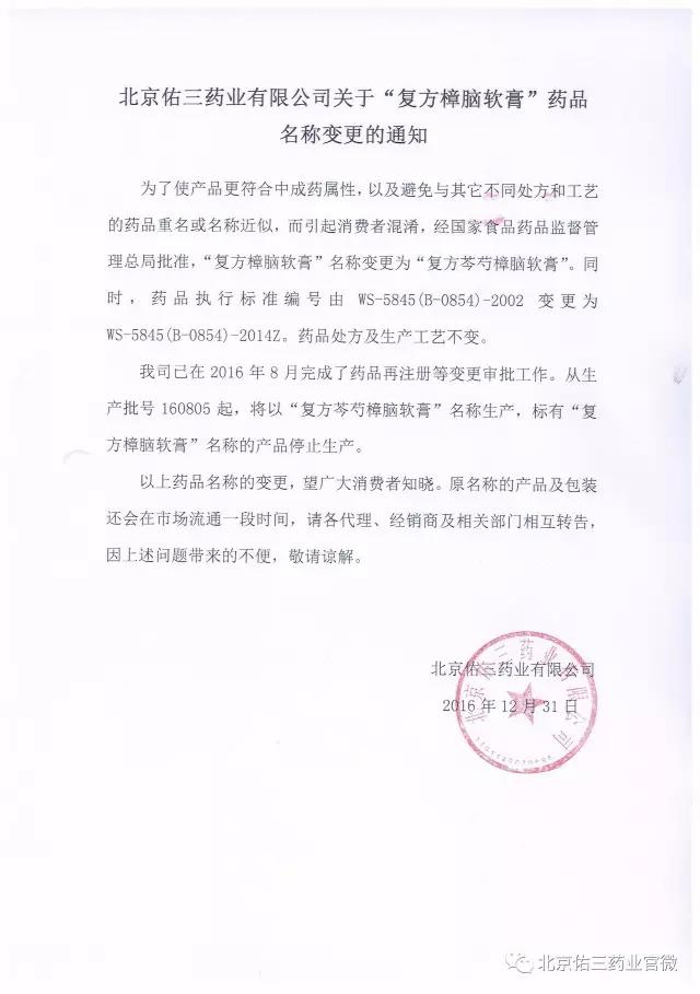 “復(fù)方樟腦軟膏”正式更名為“復(fù)方芩芍樟腦軟膏”
