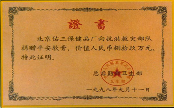 復方芩芍樟腦軟膏(曾用名“華夏1號”、“平安軟膏”),自誕生以來,就在災難面前一次次地發揮驚人的作用。珍寶島事件、越南自衛反擊戰、98年抗洪搶險、汶川地震,佑三公司數次捐贈,為無數飽受苦難的人民解決病痛困擾。
