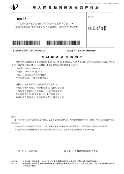 佑三——平衡調(diào)節(jié)儀國家專利申請(qǐng)受理書